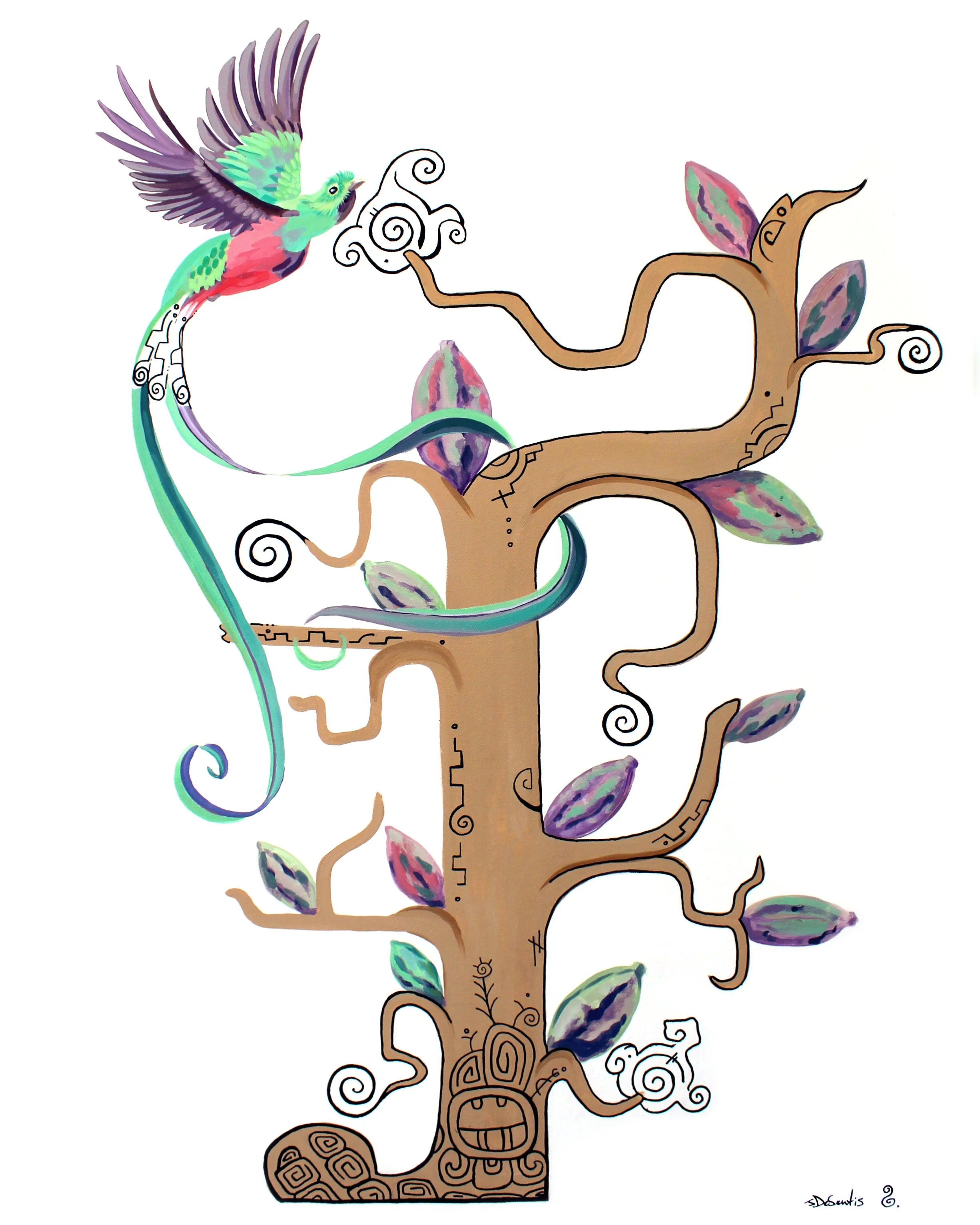 The Quetzal is found throughout Central America. It is sacred to the Maya and Tenochca peoples and inspired by artist's shared indigenous ancestry with the Central American and Mexican community. These three quetzals are perched on a historic water fountain found in Patterson Park, Baltimore. The Quetzal's feathers are acting like water pouring out from the dry fountain, symbolic for an abundance for or overflow of life.